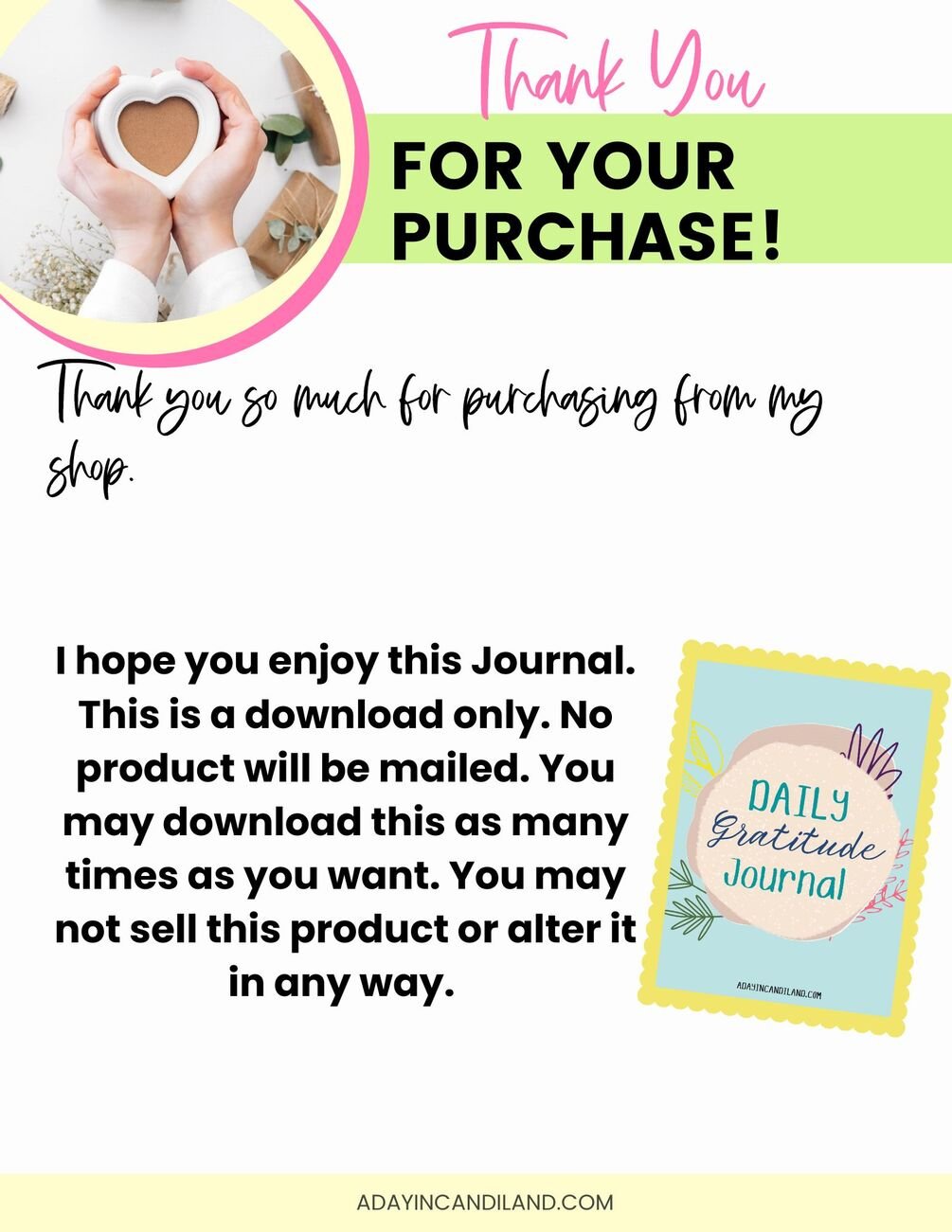 This daily Gratitude Journal includes 7 daily sheets plus a cover. You can print off these sheets as often as you like and put in a notebook. Each Page is Unique with places to write what you are grateful for in addition to adding a scripture or verse you like, in addition to each day being a different color.